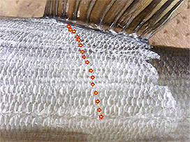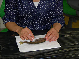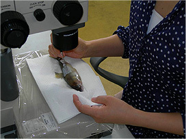 そこで、当研究所では、計数上のルールを定め、誰でも、簡単に、高い精度で計数できるようなサンプル処理方法を検討し、側線上方横列鱗数の計数マニュアルを作成しました。