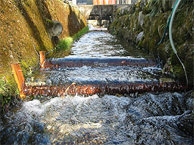 (間伐材を使用) の設置を試行しました。この研究では、下呂支所の実験水路を使用して
