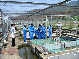 また、スライドでの解説のほか施設見学を行い、飼育している魚種や飼育器材を紹介しています。