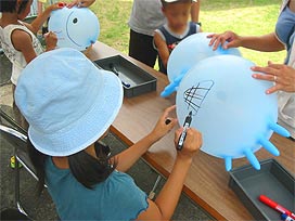 このプログラムは、魚のかたち、特にひれの数や位置、名前などをスライドで解説します。また、実験用ゴム手袋を使って風船を作り、魚の絵を書く実習を行います。