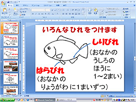 このプログラムは、魚のかたち、特にひれの数や位置、名前などをスライドで解説します。また、実験用ゴム手袋を使って風船を作り、魚の絵を書く実習を行います。
