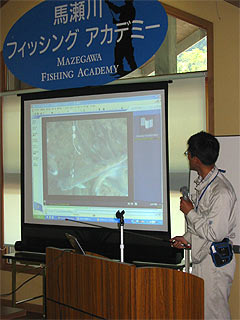 この講座は、NPO法人馬瀬川プロデュースにより毎年実施されている釣り教室で、県内だけでなく、首都圏や大阪府から20名の参加者がありました。9日の座学では、当研究所の職員が講演を担当し、アマゴなど渓流魚の生態や増殖の方法について解説しました。