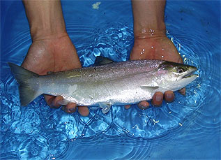 当研究所では、水産試験場の時代に本荘鉄夫博士を中心とする研究グループにより、海に降るタイプ(スモルト)のアマゴを晩秋から冬にかけて放流すると、翌春、放流した河川にそれらが “かわます”となって戻ってくることを実証しました。そして、これらは、サツキの咲く時期に川を遡上することにちなみ、本荘博士によって