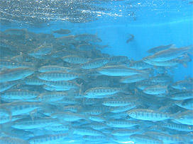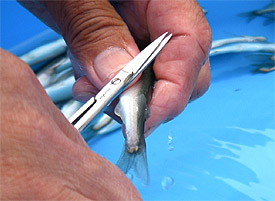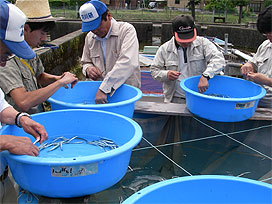 この研究は、放流後のアユの成長・移動範囲・漁獲状況を調べるもので、他の放流アユと識別できるよう、あらかじめ一部のひれをハサミで切って標識しておきました。これらのアユは、漁業協同組合の方々に協力していただき、今日の夕方にトラックで調査区間へ輸送して放流しました。