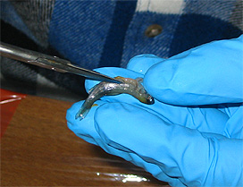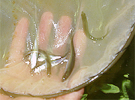 ミミズ類には、よく知られている陸生のミミズ類以外に水生のミミズ類がいます。水生のミミズ類は、陸生のものよりも一般に小型で、10cmを超えることはまれなので、あまり知られていませんが、河川や湖沼などでは、魚類など他の水生生物の餌や有機物の分解者として重要な役割を果たしています。水生ミミズ類の種類は、剛毛や生殖器の形を顕微鏡で