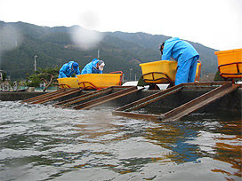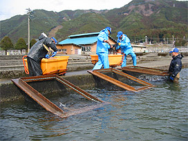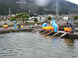年 11月 3日 ・ 2010年 1月 3日) と配合飼料を併用して給餌しています。やがて、アユの成長とともに、動物プランクトンを併用する給餌から、配合飼料のみの給餌に移行します。