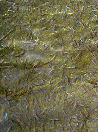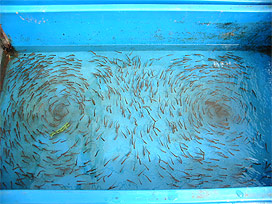 現在、本所で飼育中のアユの稚魚には、配合飼料のみを与えています。配合飼料の給餌で気をつけなくてはならないのは、餌の食べ残しによる水質の悪化です。当研究所のように小規模な水槽で飼育する場合は、水質の悪化が急に進行することがあるので、特に注意が必要です。アユの仔魚は、底に沈んだ餌は食べません。当研究所では、食べ残しをできるだけ出さないように、アユの摂餌に適した浮きやすい餌を使用しています。