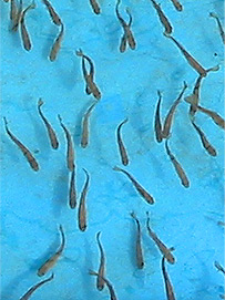 FRP (強化プラスチック) 水槽で飼育しています。水槽内には緩やかながらも流れがあり、稚魚は泳ぎながら定位しています。