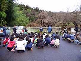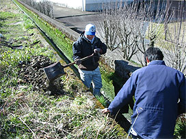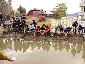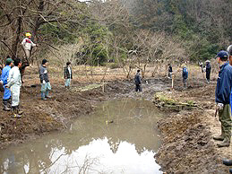 当日は、関係者や地域の方々が 20名ほど集まり、子供たちが観察しやすいように、池の周囲の足場を固めるなどの作業を実施しました。