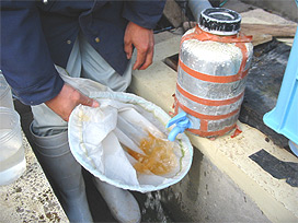 28℃程度に加温した 3%食塩水中に入れておくと、1日ほどでふ化します。当研究所では、アルテミアを毎日ふ化させており、容器内のアルテミアをプランクトンネットで回収して、カジカの仔魚に与えています。