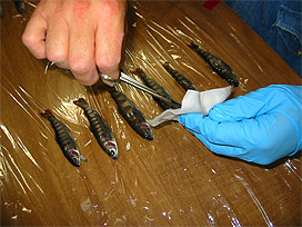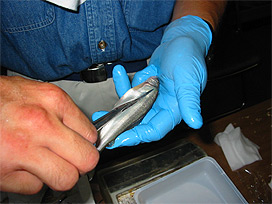 標識として脂ビレを切除しているところ