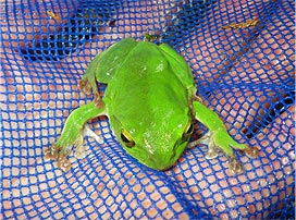 渓流での調査の際に見つけたシュレーゲルアオガエルです。