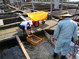 午前中は飼育魚のニジマスに餌を手撒きしてもらったのち、魚の移動を行いました。午後からは、魚の移動や選別作業を体験してもらいました。暑い中、慣れない作業で大変だったと思いますが、内水面の水産業、もしくは
