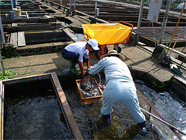 今日の作業では、下呂支所の A 号池で飼育中のヤマメの選別を行いました。