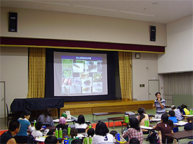 当日は当研究所の職員 2 名が講師として参加し、田んぼや周辺の用水路でみられる生きものを紹介するとともに、子どもらが捕まえた生きものなどの解説を行いました。