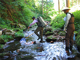 地元の漁業協同組合の組合員や当研究所の職員が魚類の採捕に協力し、アマゴ