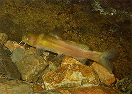 源流部で魚類相の調査中に、水の中にくねくねと動く生き物の姿が・・。「おっ、イワナか?」