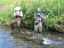 河床を掘るメス親魚 |