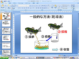 (しんぎょほうりゅう : 産卵期に十分に成熟した魚を河川に放流し、この放流魚に自発的に産卵させる増殖手法)」