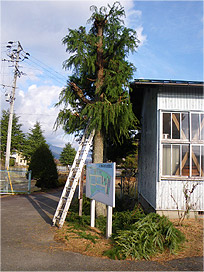 紅葉が終わり、いよいよ本格的な冬が間近です。積雪に備えて、下呂支所のヒマラヤスギを枝打ちしました。