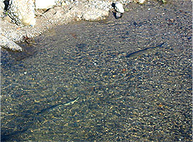 自然界では、アマゴ ・ヤマメ ・イワナなどサケ科魚類の雌の親魚は、秋に川底を掘って産卵し砂利で埋めます。冬に砂利の中で孵化した仔魚は、すぐには川の中には出てきません。仔魚は、腹部の卵黄を吸収しながら、砂利の中で春までじっと過ごします。そのため、川で仔魚を観察できる機会はなかなかありません。