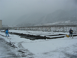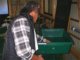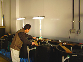 ふ化盆をふ化室のコンクリート水槽内で開ける |
