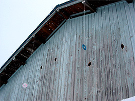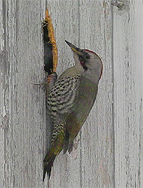 このところ、アオゲラがたびたび飛来して下呂支所の検卵室の外壁に穴を開けています