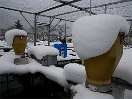 井戸の中に藻が生えると、配水管が詰まるなどトラブルの原因になるので、春から秋は、藻が生えないよう井戸に日よけシートをかぶせています。しかし、冬は、雪の重みで破れる恐れがあるので、毎年、雪が降り始める直前に日よけシートを取り外すようにしています。