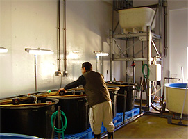 卵黄を吸収し終わる時期になると、ふ化水槽からふ化盆を取り出して、仔魚をふ化室のコンクリート池に収容します。われわれはこれを