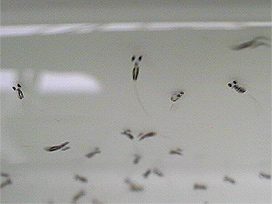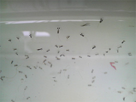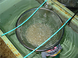 検卵後の発眼卵は、ふ化水槽に吊したザルに収容していました。ふ化した仔魚は、このザルの網目を抜けて水槽内を泳ぎ回っています。この後、ここから回収した仔魚を仔稚魚飼育水槽に移し、人工海水