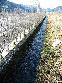 河川水は、飛騨川 (益田川) から水路を使って導入しています。この水路では、草の除去