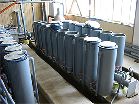 カジカの仔稚魚は、ふ化直後から海水で飼育します。内陸部にある当研究所では海水を採取することができないので、カジカの仔稚魚の飼育には人工海水を用いています。人工海水は、食塩