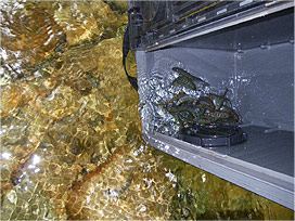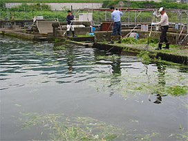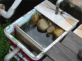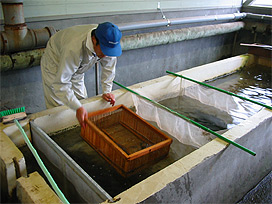 アジメドジョウは、伏流水の湧き出す礫中に潜入して越冬し、春になるとその礫中で産卵していると見られており、下呂支所では、伏流水の環境を模した産卵床を設置した水槽で産卵をさせています