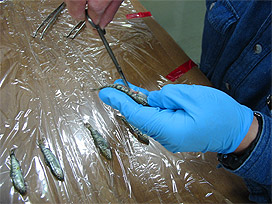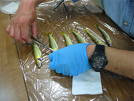 えらと腎臓の組織片を寒天培地に塗って培養した後、菌の有無を調べる予定です。