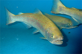 (飛騨川) でもサツキマスの漁獲記録があります。ダムが建設される前の時代には、サツキの咲くこの時期、益田川にもサツキマスが遡上していたことでしょう。現在は、海から益田川まで遡上する個体はいないものと考えられますが、ダム湖を海の代用とする降湖型の個体が時々見つかっています