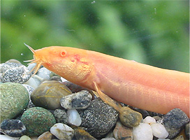 “ヒドジョウ” が挙げられます。ヒドジョウは、体表に黒色の色素がないものの、黒い色素をつくる能力自体は持っており、目が黒いのが特徴のひとつです。これはアルビノではなく、白変種や黄変個体などと呼ばれています。一方、今回、下呂市内の水路で見つかった個体は、体表だけでなく目にも黒色の色素がない