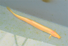 アルビノ (白化個体) とは、黒色の色素をつくる能力を持たない個体のことです。魚類を含めさまざまな動物でごくまれに出現しますが、自然界で生き残る個体は少ないと考えられ、発見されるとよくニュースになります。鳥類やほ乳類では名前の通り白い個体が多いですが、魚類では黄色っぽくなるものが多いようです