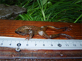 これも調査中に捕獲されたイワナです。口からカエルの足が・・・・・。しばらくすると吐き出しました。どうやら獲物はアカガエルの仲間のようです。