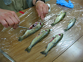 午前中はニジマスやアマゴ等の飼育魚に餌を手撒きで与えたり、飼育池の掃除やアマゴの池移動等を行いました。午後からは生徒から職員に対して当研究所の仕事内容や魚に関する質疑応答を行った後、ニジマスを解剖してスケッチしたり、顕微鏡で魚の鰓や病気の原因になる細菌を観察しました。
