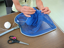 タモは、野外での魚類調査や所内での飼育魚の管理に欠かせない道具です。使用頻度が高いので、よくほつれたり穴が開いたりしますが、その都度、職員が手作業で補修して、少しでも長く使用できるようにしています。