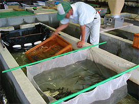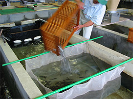 同じ池で飼育している同じ系統の魚でも、成長速度には個体差があります。水槽実験などでは、使用する魚のサイズを揃える必要があるので、選別かご