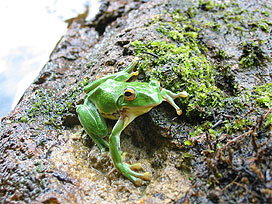 (Rhacophorus arboreus) と思われます。本種は水の中ではなく、水面の上を覆う木の枝に泡で覆われた卵塊を産み、ふ化したオタマジャクシが池に落ちて育つという一風変わった産卵をすることで有名です。