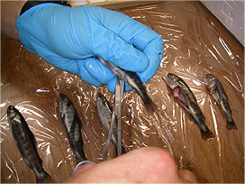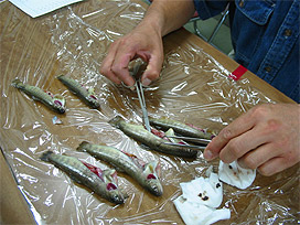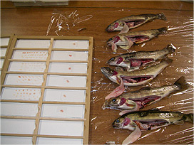 今週、診断の依頼があったのは、アマゴとニジマスです。養殖場は、自然界よりも高い密度で魚を飼育しており、病気が蔓延すると大きな被害が出る恐れがあるので、原因の把握と適切な対応が不可欠です。当研究所では、寄生虫