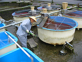 下呂支所では、魚の飼育には井戸水と河川水を使用しています。ただし、井戸の水量に限界があるため、大部分の魚の飼育には河川水を使用しています。