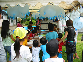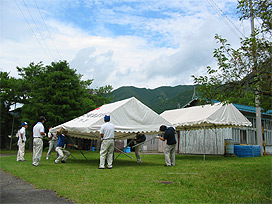 テントの組み立て、展示水槽やパネルの設置作業を行い、準備がほぼ完了しました。ただ、このところ曇りや雨の日が続いているので、当日、天気が回復することを祈るばかりです。