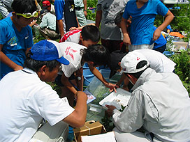 養老町笠郷地区で 23 日に開催された 「田んぼの生き物調査」