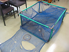 このトラップは、職員の手作りによるもので、水路への遡上魚の調査あるいは水路からの降下魚の調査で使用しています。入口は上流側と下流側にそれぞれ設けてあり、内部は半々に区切ってあるため、遡上魚と降下魚を同時かつ別々に採捕できます。網地がほつれたり穴が開いたりした時には、職員が手作業で補修し、少しでも長く使用できるようにしています。