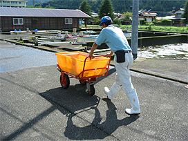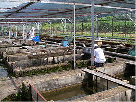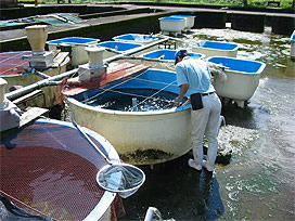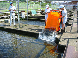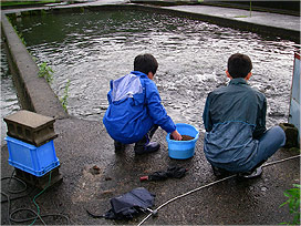 下呂支所では、屋外の飼育池でアマゴやニジマスなどを飼育しています。魚が混みあっている飼育池では病気が発生しやすくなるので、個体数や体サイズに応じて、より大きい池に魚を移し替えるか、いくつかの池に分けて飼育するようにしています。