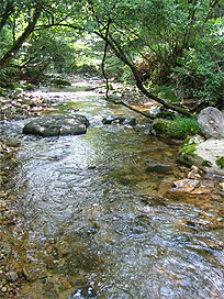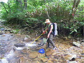 11 日の調査に引き続き、同じ渓流の下流側の区間で魚類調査を行いました。今日は