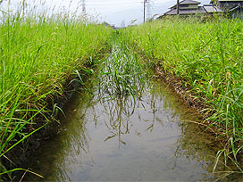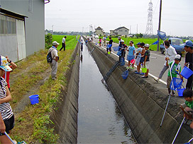 「田んぼの生き物学校」 では、小学生およびその保護者を対象に、環境保全に対する関心を高めることなどを目的に開催される事業です。当日は、農業用排水路での生き物調査を行いましたが、絶滅が危惧されるメダカなどもみられるなど、数多くの生物種が観察できました。